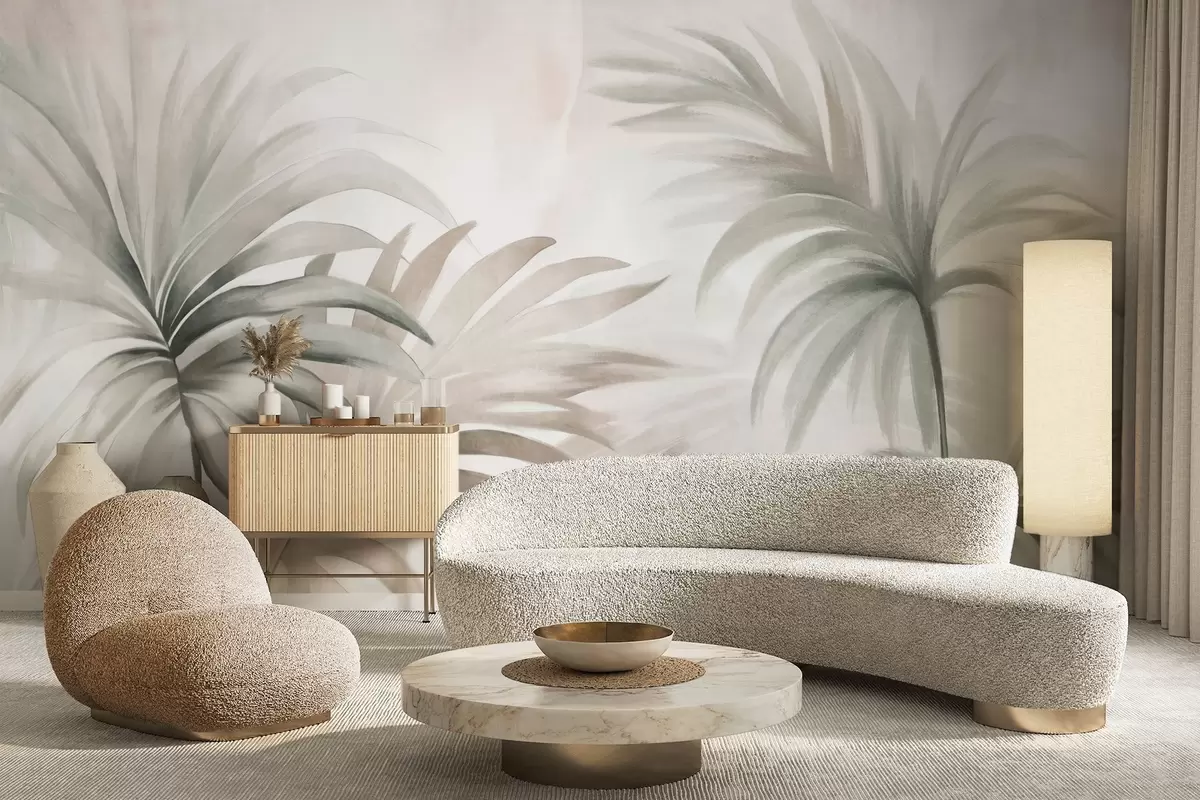 Fototapetak Pálmafa texturált levelek semleges színekben, bézs absztrakt háttér, lágy ecsetvonások, trópusi texturált lombozat Nr. w09380