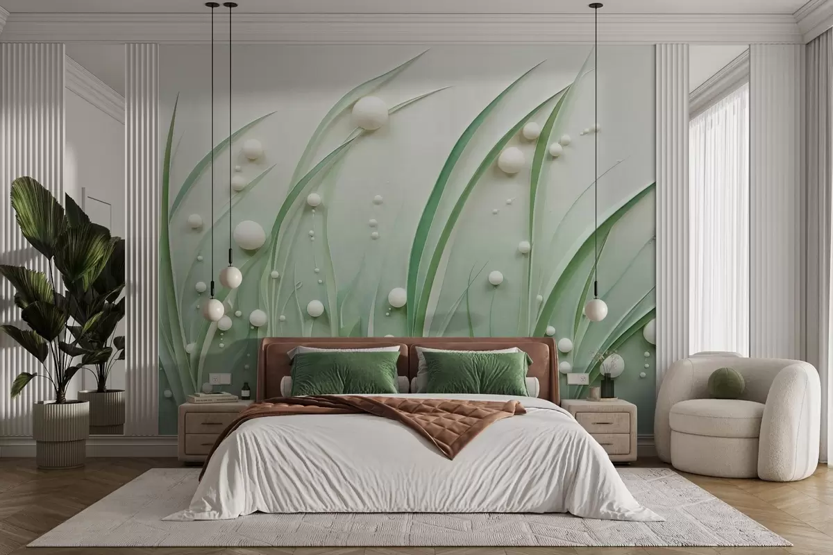 Fototapetak Absztrakt zöld fű fehér gömbökkel, világoszöld háttér, textúrált, tiszta vonalak, minimalista stílusban Nr. w09382