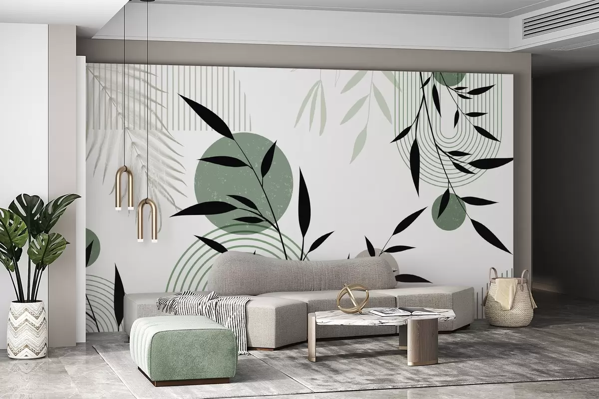 Fototapetak Texturált absztrakt nyomat geometriai formákkal, körökkel és ívekkel, valamint fekete és zöld növényekkel fehér alapon Nr. w09384
