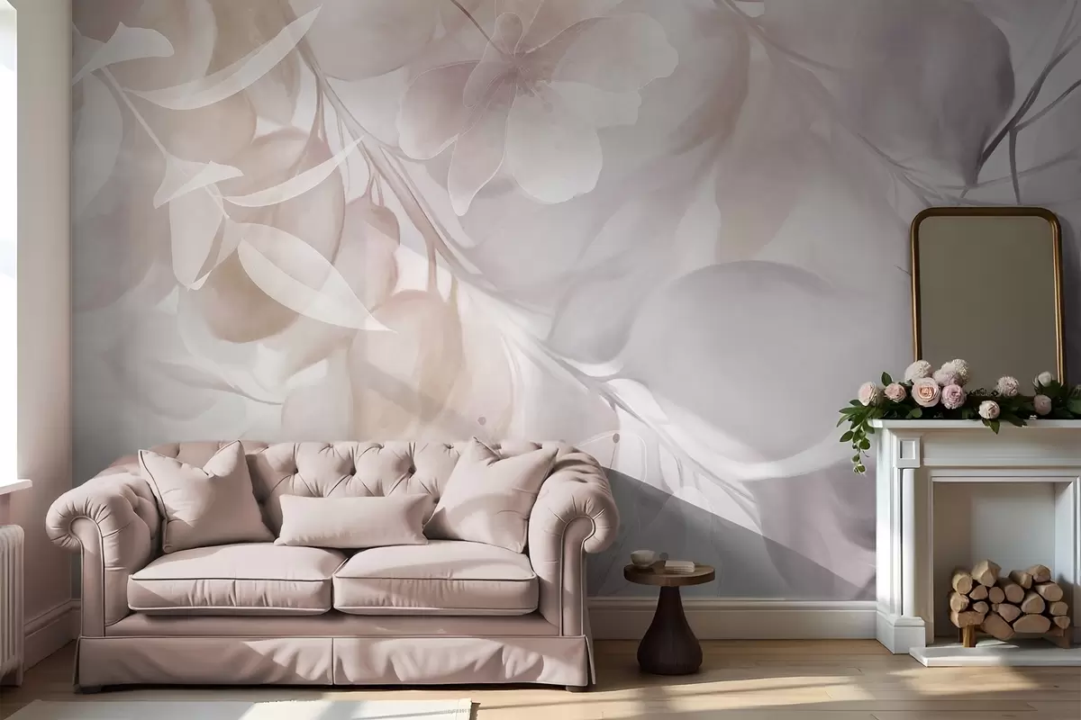Fototapetak Virágművészet halvány bézs és barna virágokkal, levelekkel és ágakkal, lágy pasztell színekkel, akvarell textúrájú hatással Nr. w09397