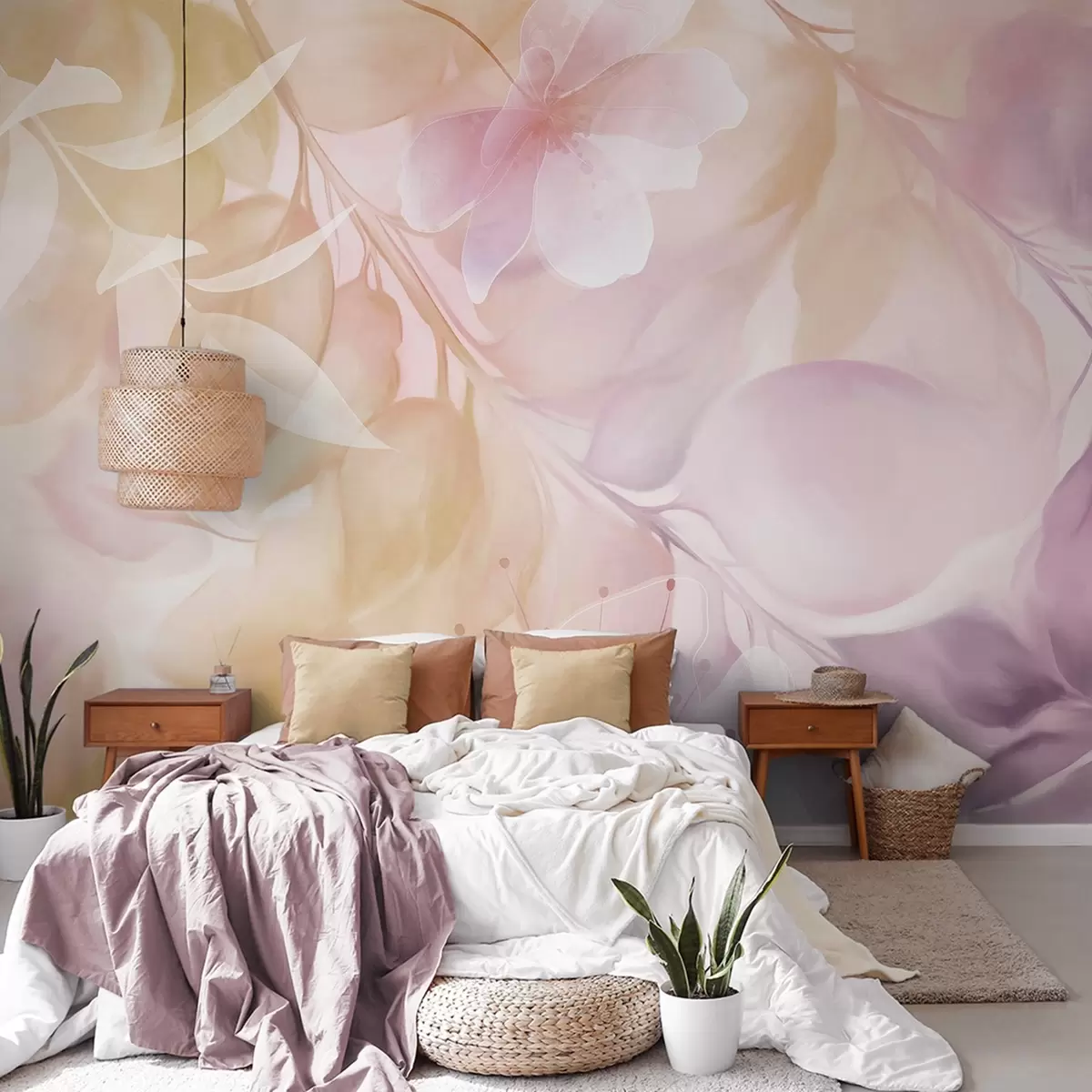 Fototapetak Virágos művészet halvány sárga és lila virágokkal, levelekkel és ágakkal, lágy pasztell színekkel, akvarell textúrájú hatással Nr. w09397v2