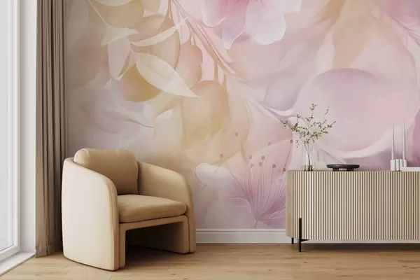 Fototapetak Virágos művészet halvány sárga és lila virágokkal, levelekkel és ágakkal, lágy pasztell színekkel, akvarell textúrájú hatással Nr. w09397v2