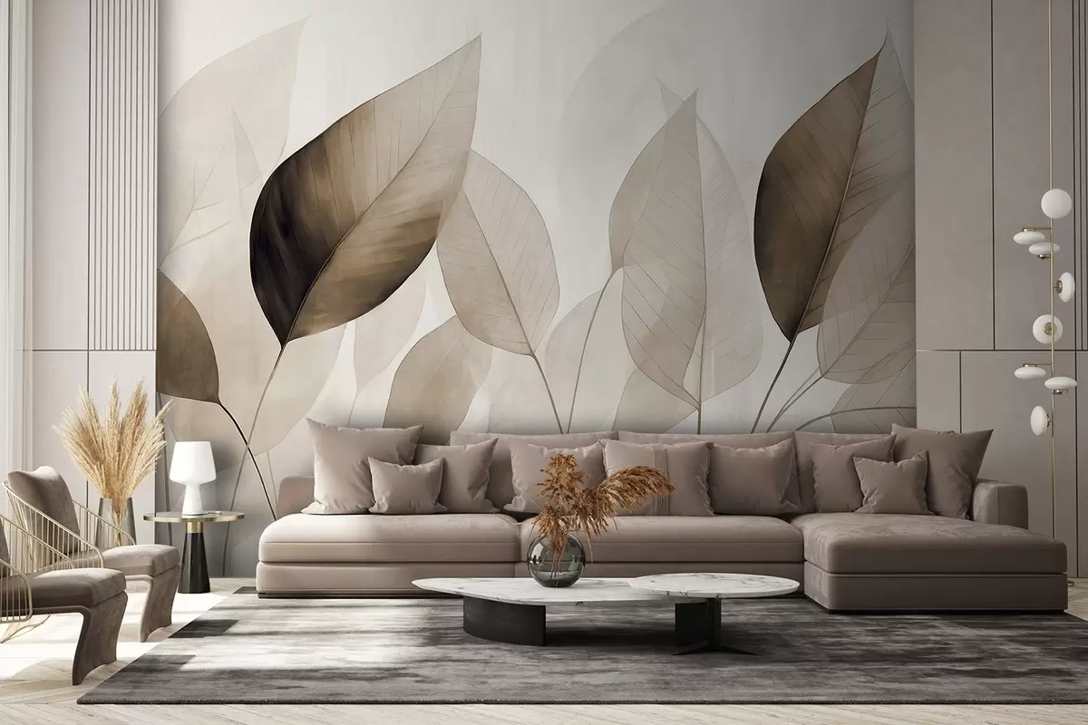 Fototapetak Texturált festmény, amely barna és bézs árnyalatú leveleket ábrázol, finom erezetekkel és szárakkal Nr. w09400v1
