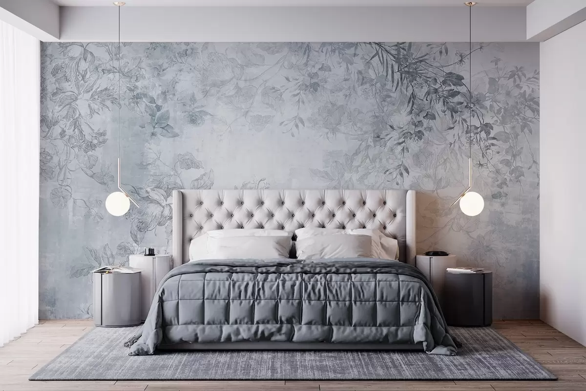 Fototapetak Vintage textúrájú virágművészet, finom kertvirágok és levelek illusztrációival, lágy kék tónusokkal Nr. w09402v1