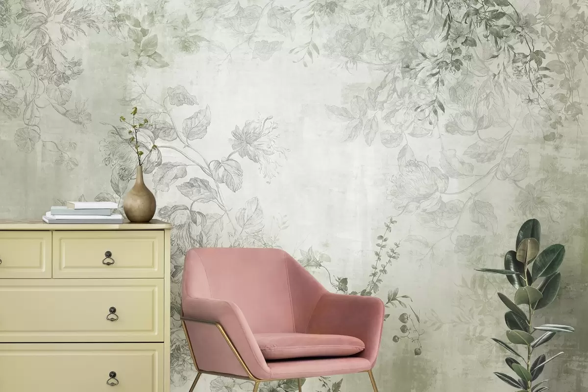 Fototapetak Vintage textúrájú virágművészet, finom rajzstílusú kerti virágok és levelek illusztrációival, lágy zöld tónusokkal Nr. w09402v2
