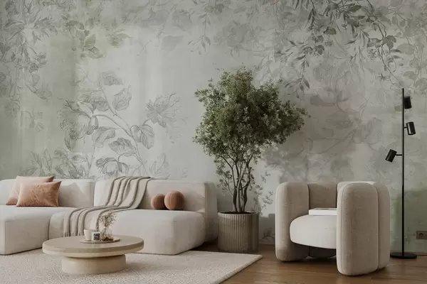 Fototapetak Vintage textúrájú virágművészet, finom rajzstílusú kerti virágok és levelek illusztrációival, lágy zöld tónusokkal Nr. w09402v2
