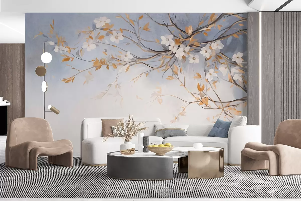 Fototapetak Fehér virágok narancssárga levelekkel egy faágon, világoskék texturált háttér, finom ecsetvonások Nr. w09415