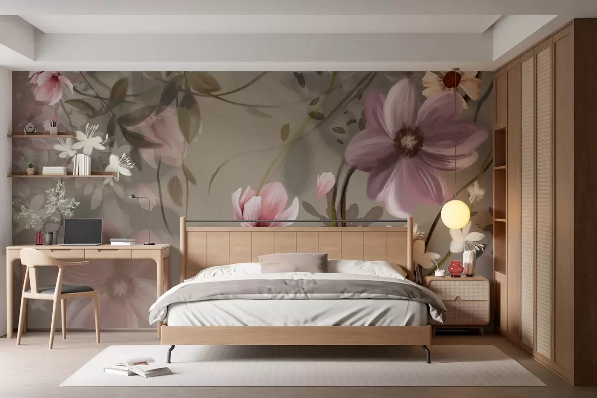Fototapetak Rózsaszín és fehér virágok barna szárakkal és levelekkel, lágy megvilágítás, tompított színek, virágdíszítés Nr. w09417