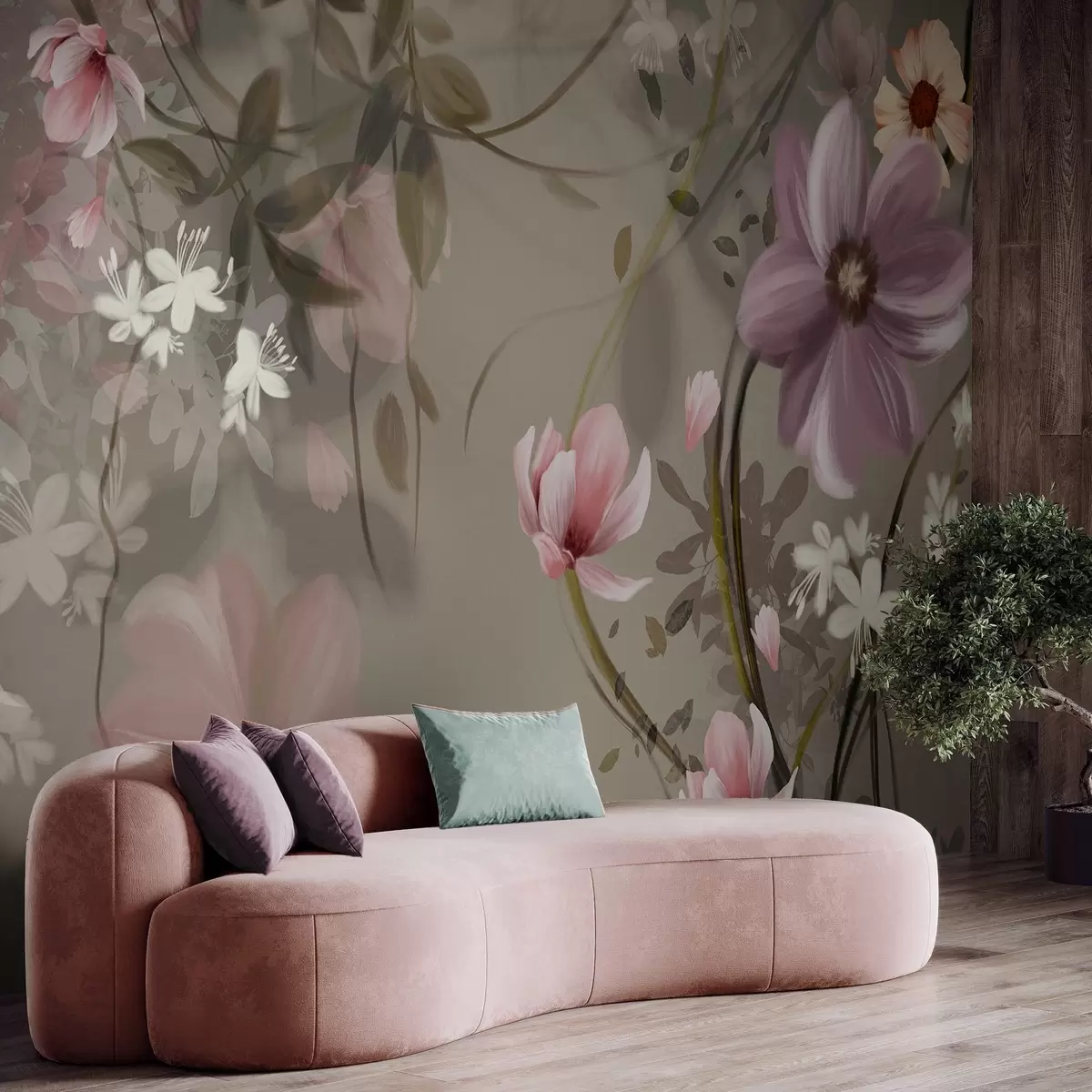 Fototapetak Rózsaszín és fehér virágok barna szárakkal és levelekkel, lágy megvilágítás, tompított színek, virágdíszítés Nr. w09417