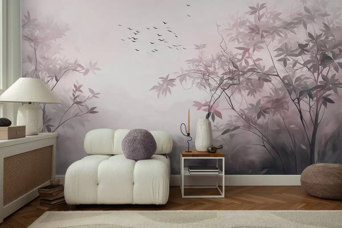 Fototapetak Texturált táj fákkal és az égen repülő madárrajjal, pasztell színek, természeti jelenet Nr. w09418v1