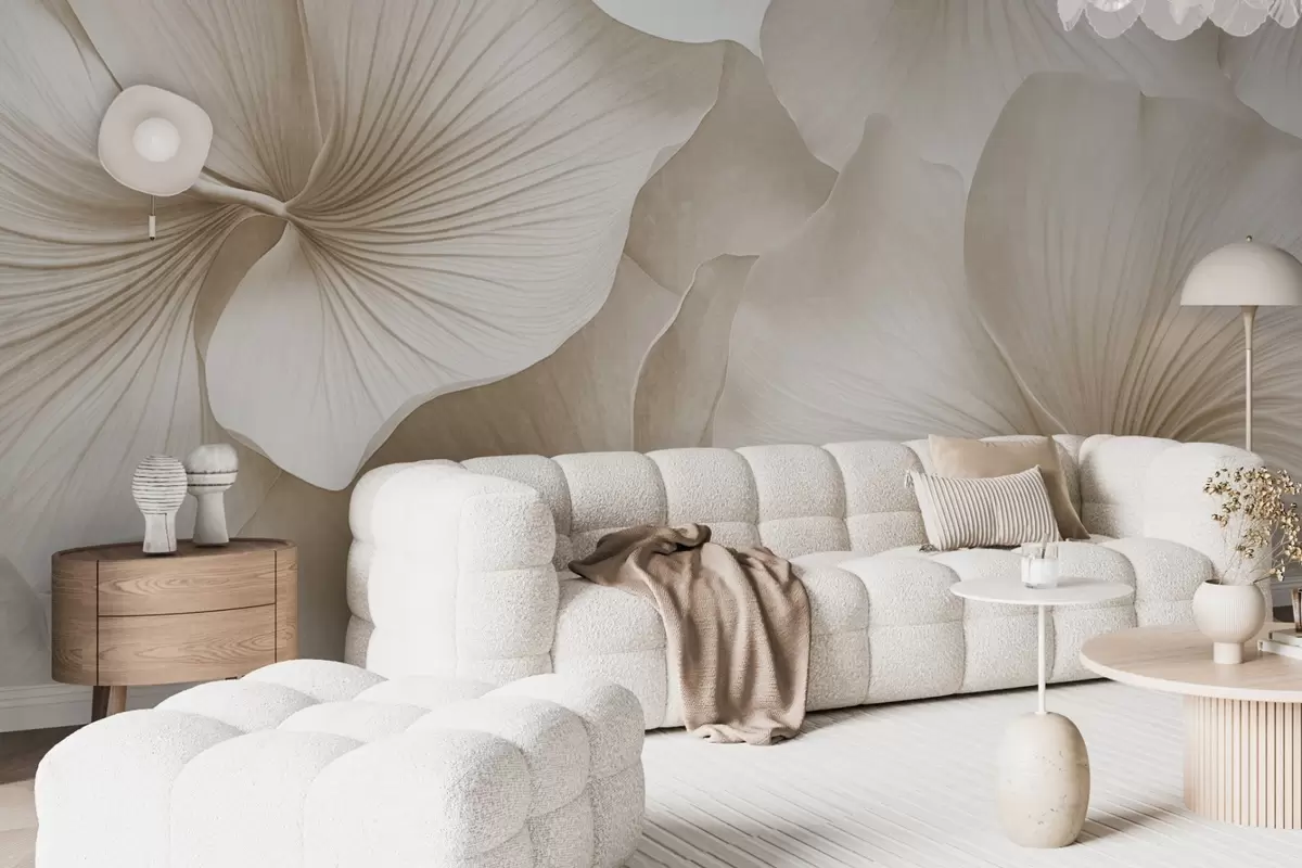 Fototapetak Fehér és bézs színű ginkgo levelek, puha textúra, absztrakt virágos háttér, minimalista modern stílus Nr. w09421v1