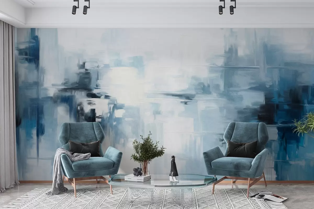 Fototapetak Absztrakt textúrájú tájképfestmény imitáció kék és fehér ecsetvonásokkal, modern stílusban Nr. w09422