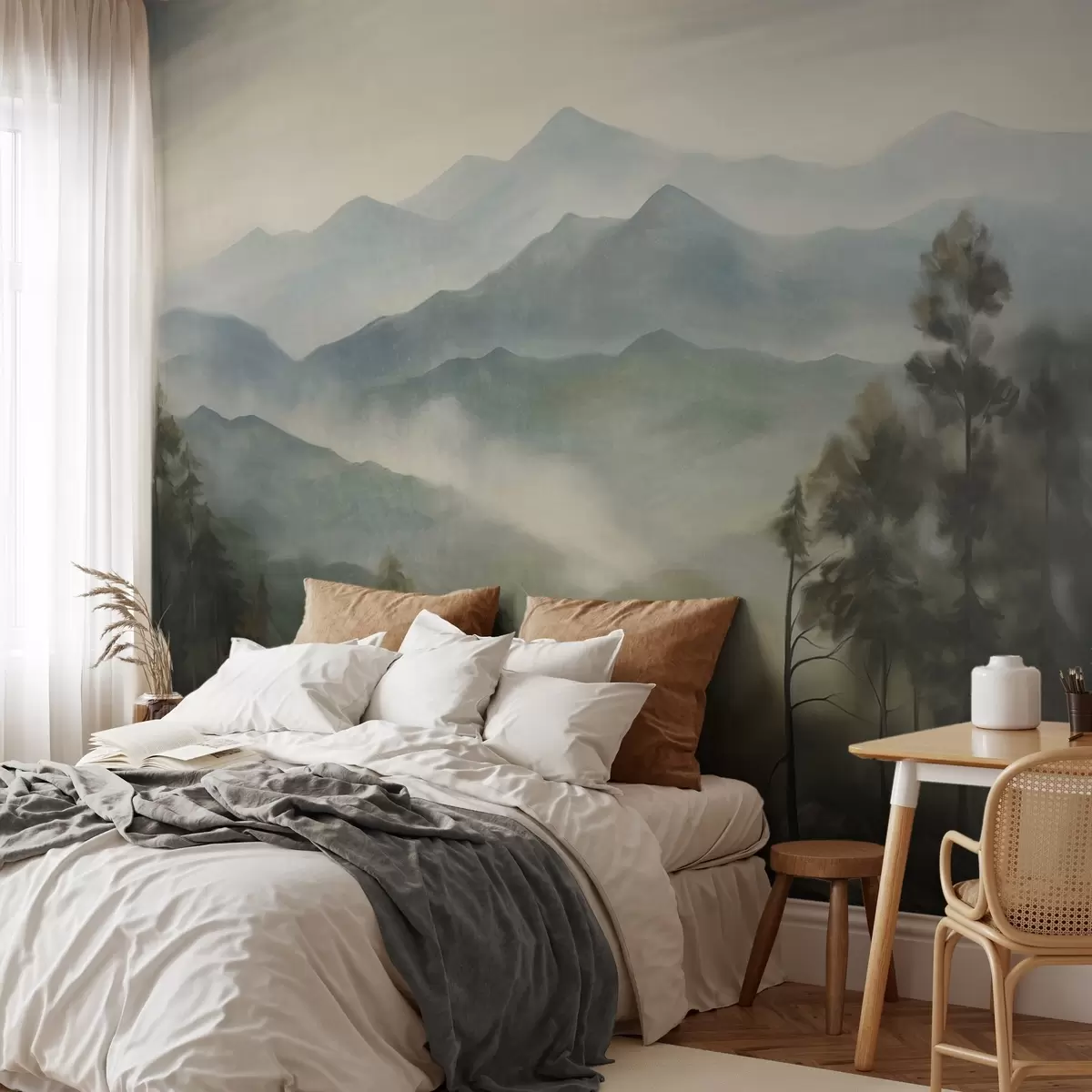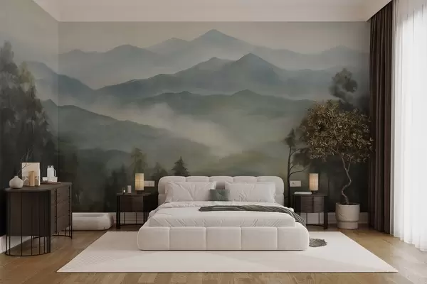 Fototapetak Ködös hegyvidék fákkal, köddel, felhős éggel, tompa színekkel, tájképfestészeti stílusban Nr. w09424