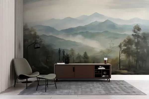 Fototapetak Ködös hegyvidék fákkal, köddel, felhős éggel, tompa színekkel, tájképfestészeti stílusban Nr. w09424