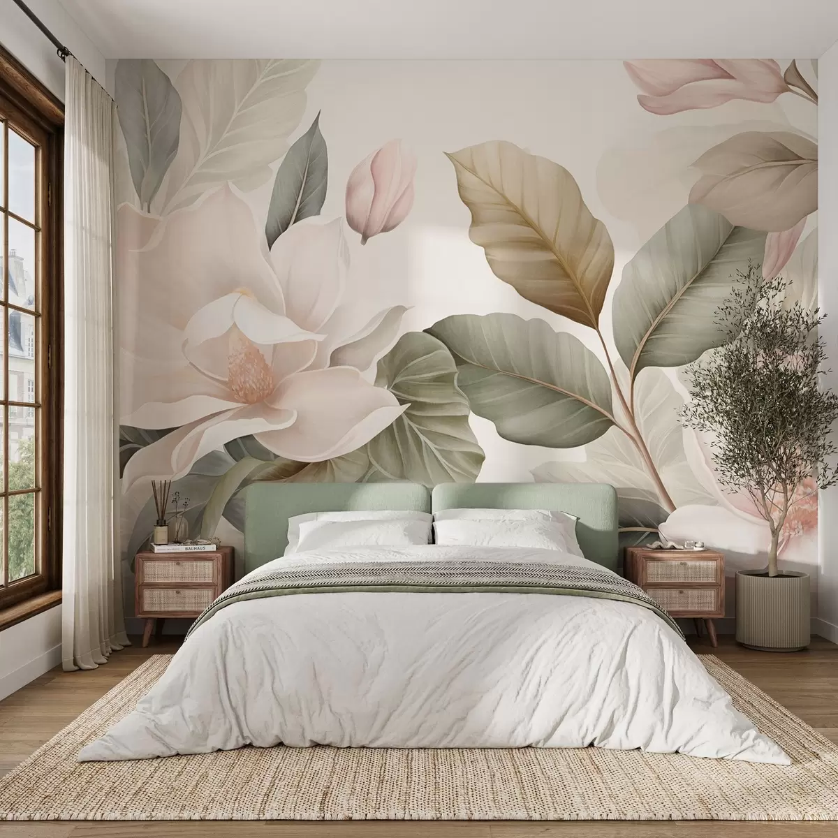 Fototapetak Magnólia virágok pasztell színű levelekkel, fehér, rózsaszín és zöld, puha, finom, akvarell stílusban Nr. w09427