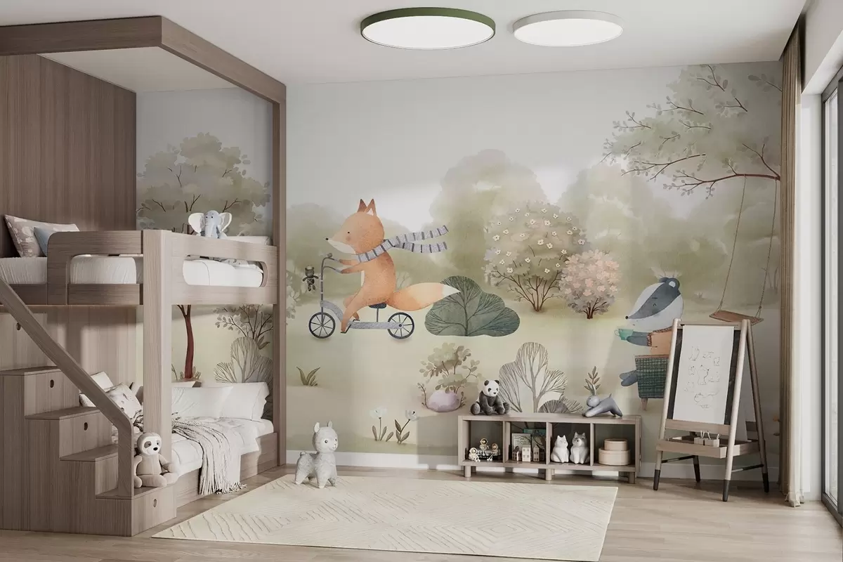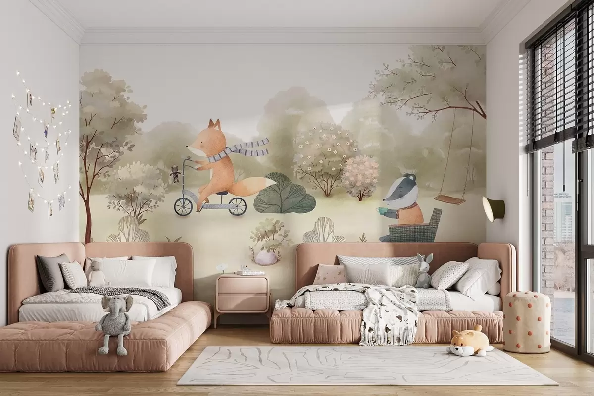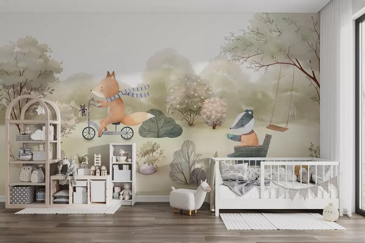 Fototapetak Fox kerékpáron és borz teával, erdei állatok akvarell stílusban Nr. w09439
