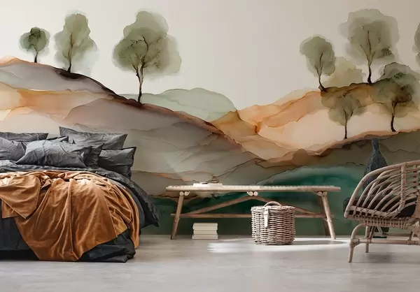 Fototapetak Absztrakt táj alkoholos tintával — dombok és fák pasztell színekben Nr. w09457