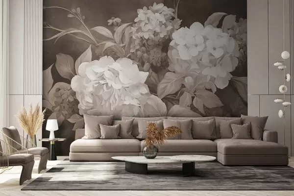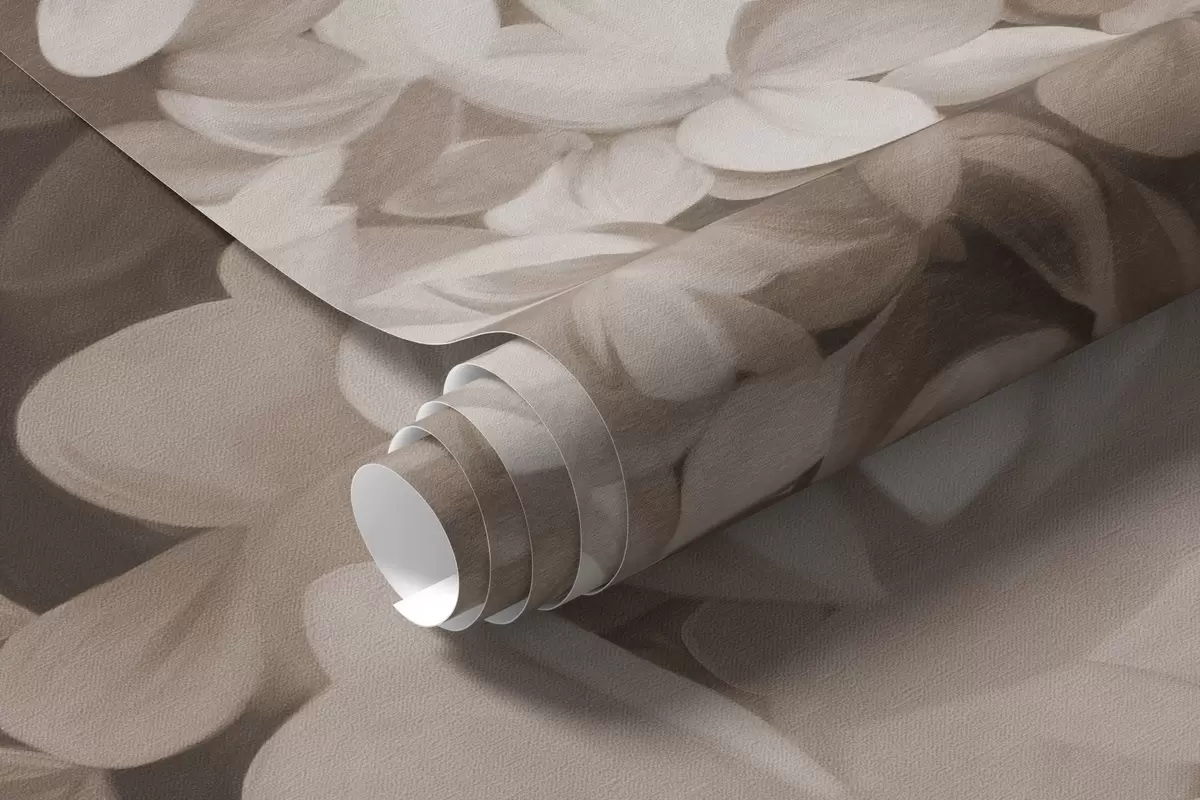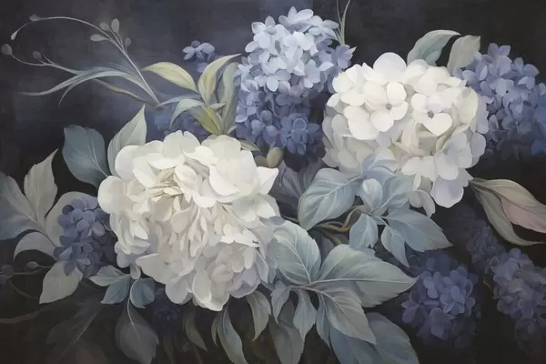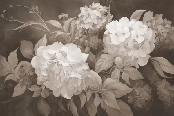 Fototapetak Texturált, sépia színű festmény, amely nagy levelű hortenzia virágokat ábrázol, absztrakt és sötét háttérrel Nr. w09465