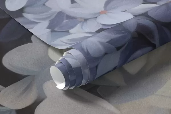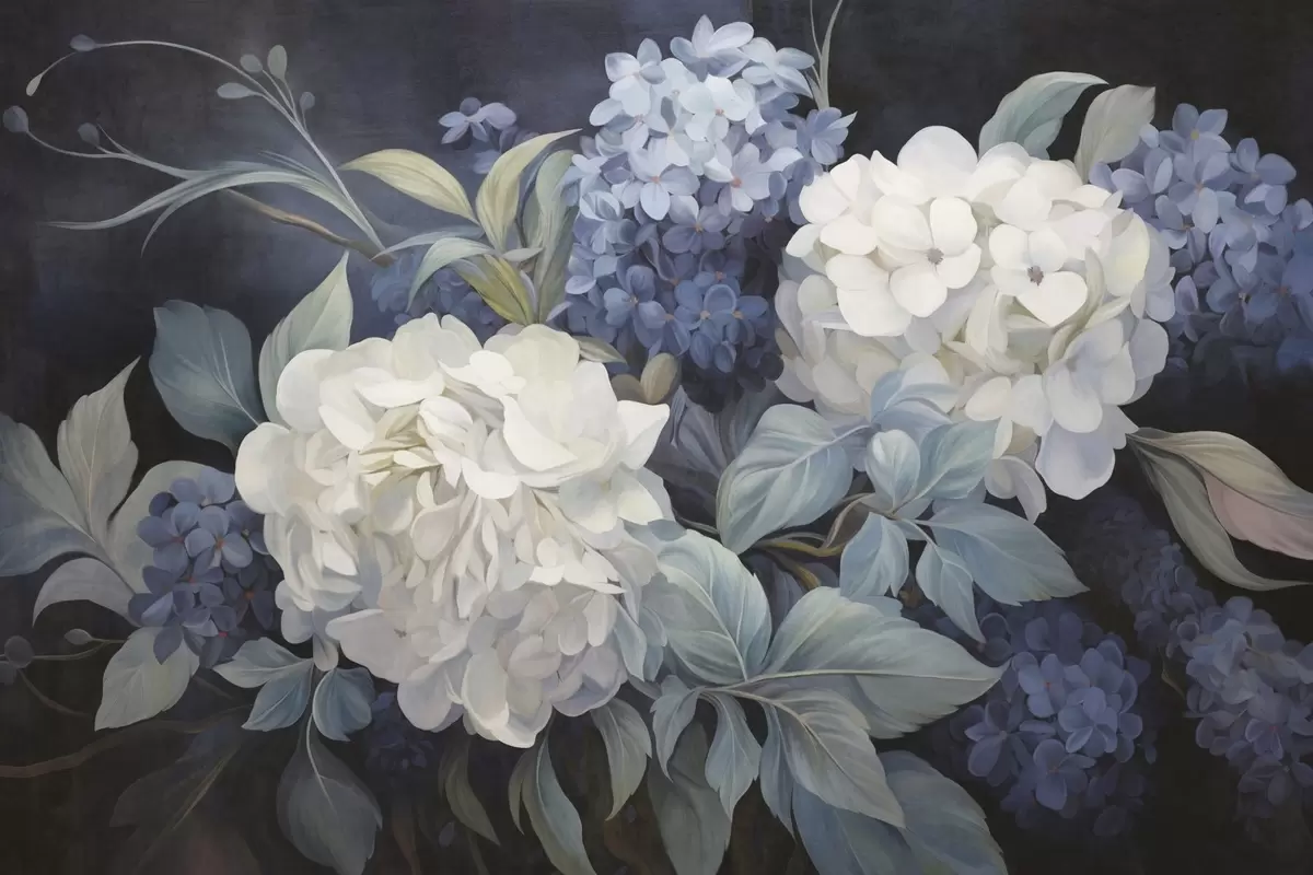 Fototapetak Texturált sötétkék festmény, amely nagy levelű hortenzia virágokat ábrázol, absztrakt és sötét háttérrel Nr. w09465v1