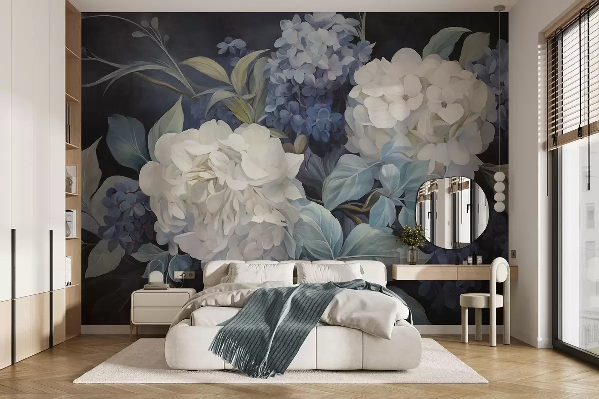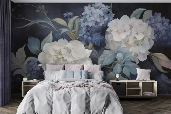 Fototapetak Texturált sötétkék festmény, amely nagy levelű hortenzia virágokat ábrázol, absztrakt és sötét háttérrel Nr. w09465v1