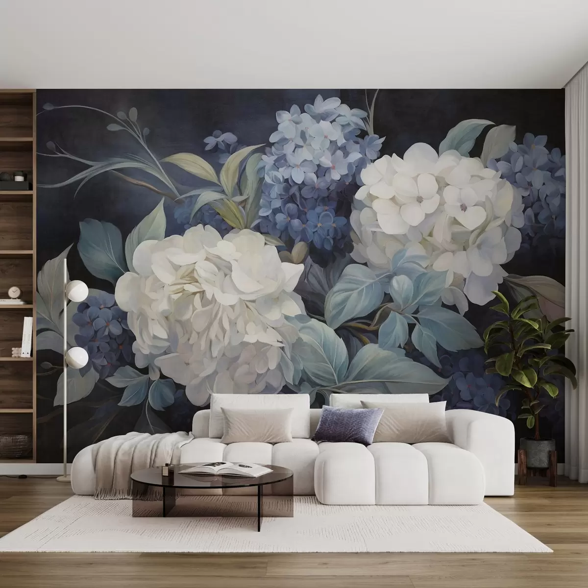 Fototapetak Texturált sötétkék festmény, amely nagy levelű hortenzia virágokat ábrázol, absztrakt és sötét háttérrel Nr. w09465v1