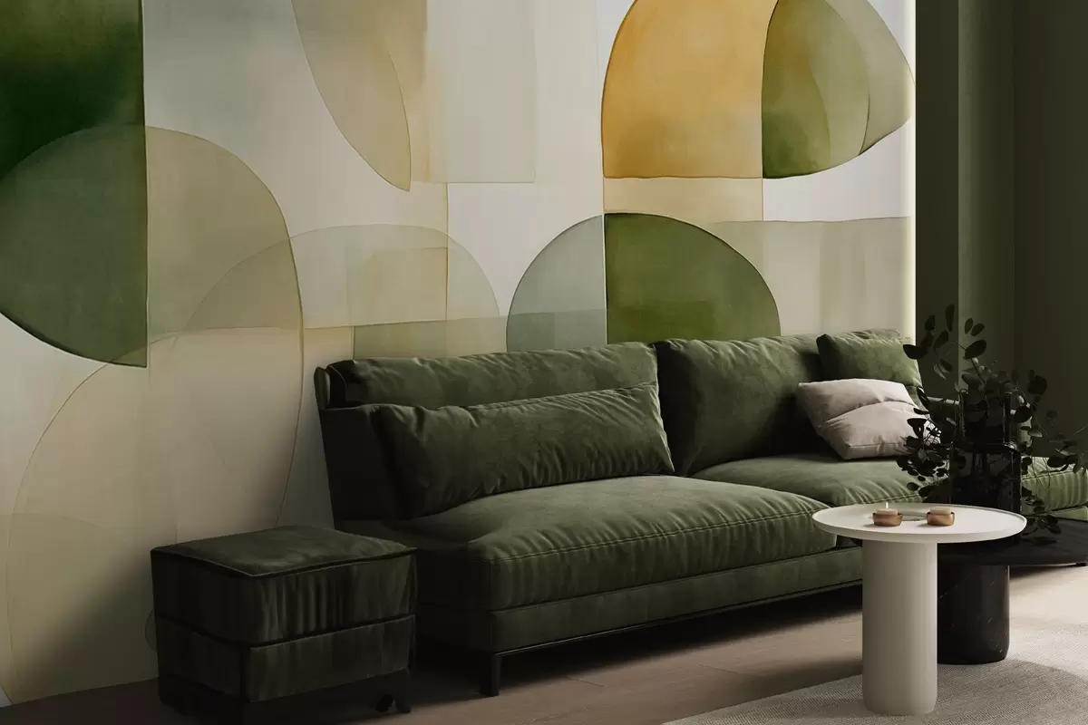 Fototapetak Absztrakt textúrájú formák zöld és sárga árnyalatokban, tompított tónusok, minimalista kompozíció, semleges háttér Nr. w09467