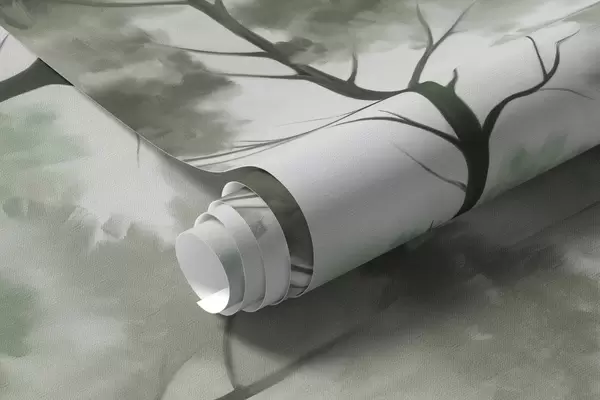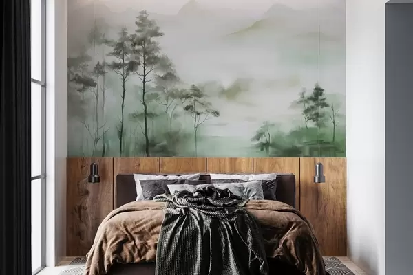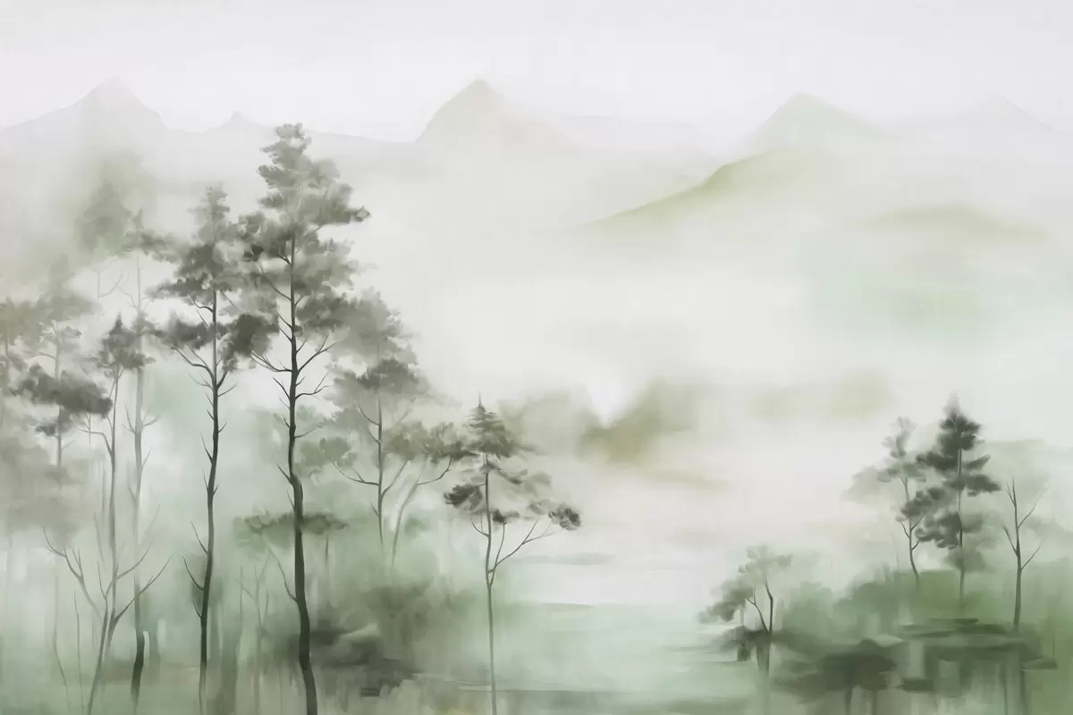 Fototapetak Ködös táj magas fákkal és hegyekkel, tompa zöld és szürke tónusokkal, minimalista stílusban, textúrával Nr. w09469