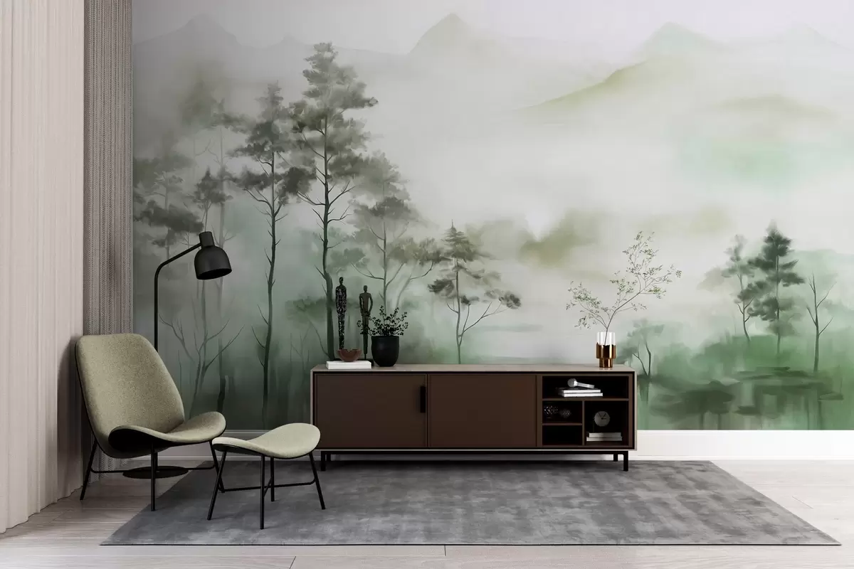 Fototapetak Ködös táj magas fákkal és hegyekkel, tompa zöld és szürke tónusokkal, minimalista stílusban, textúrával Nr. w09469