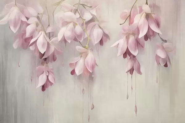 Fototapetak Lógó rózsaszín virágok, világosszürke háttér, virágos textúrájú elrendezés, botanikai művészet, pasztell színek Nr. w09471