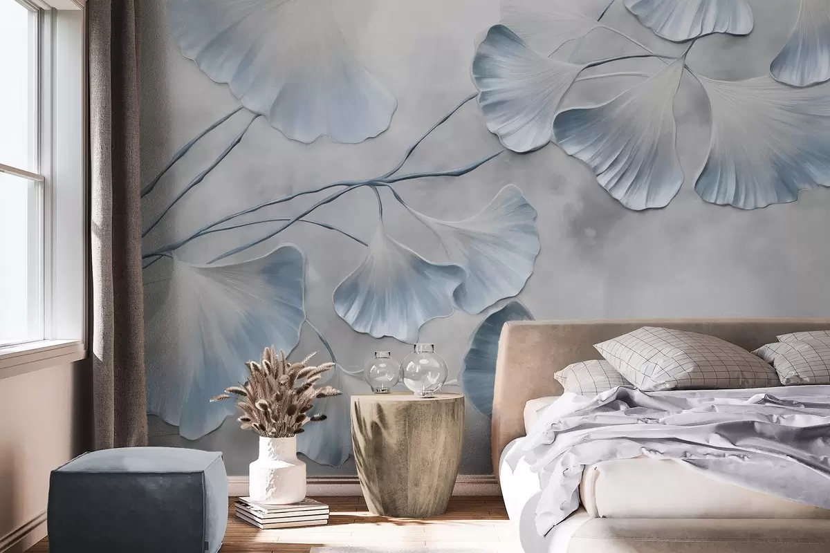 Fototapetak Ginkgo biloba levelek kék szegéllyel egy ágon, szürke textúrájú háttérrel, elegáns és minimalista dizájn Nr. w09472v1