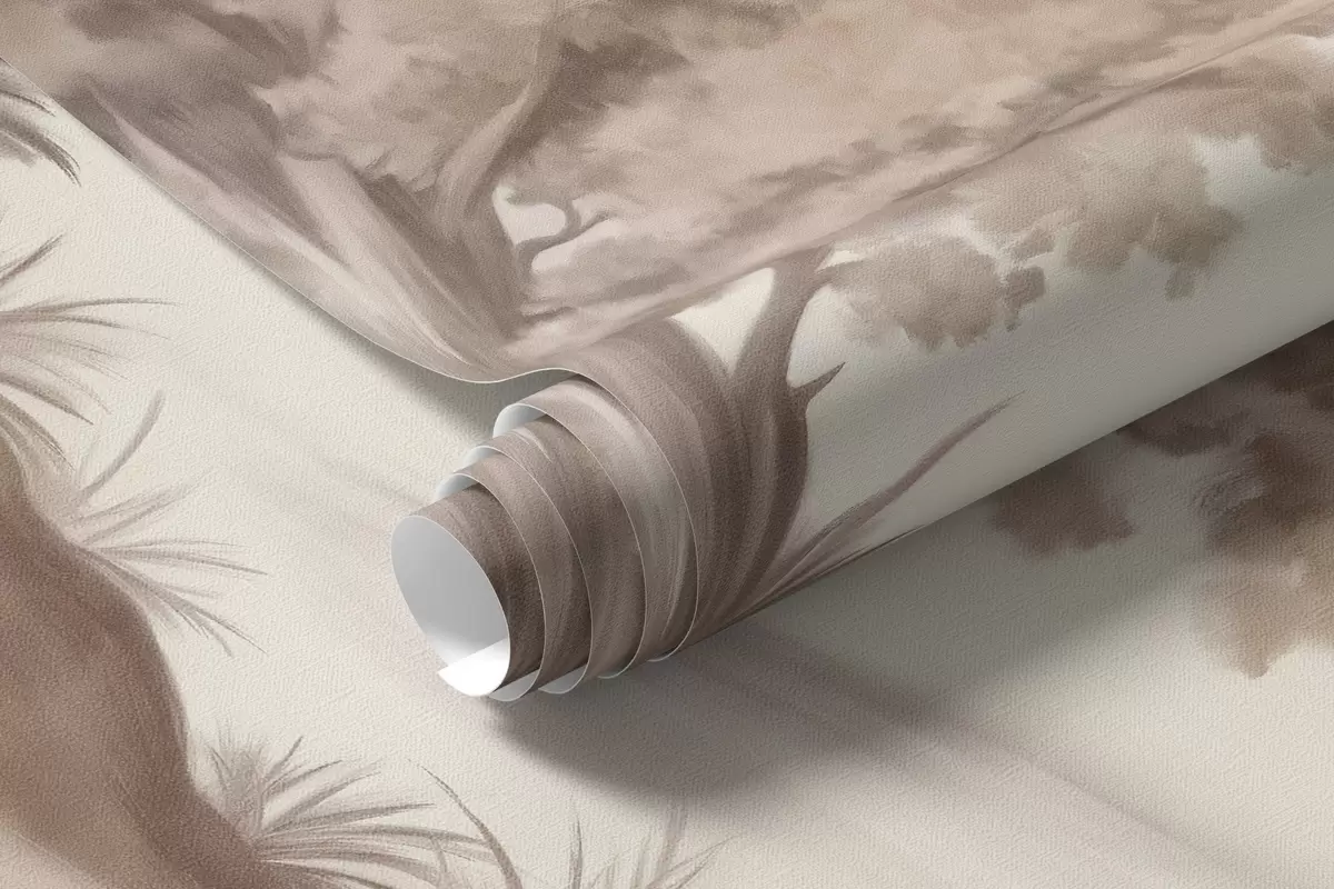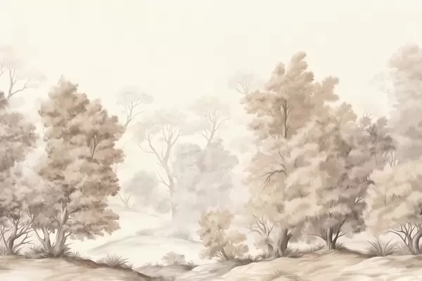 Fototapetak Texturált tájképfestmény, amely egy magas fákkal és fűvel borított erdőt ábrázol, tompított és lágy színekkel, nyugtató hangulatú jelenettel Nr. w09474
