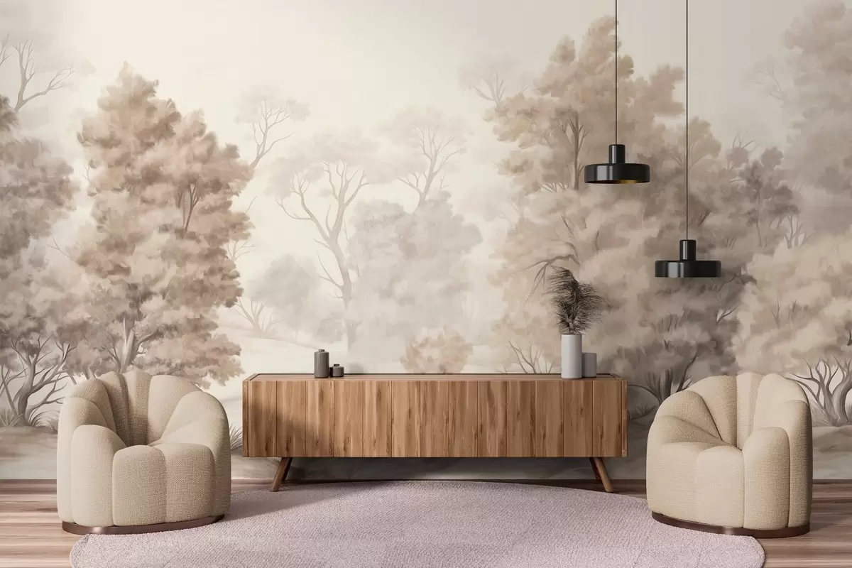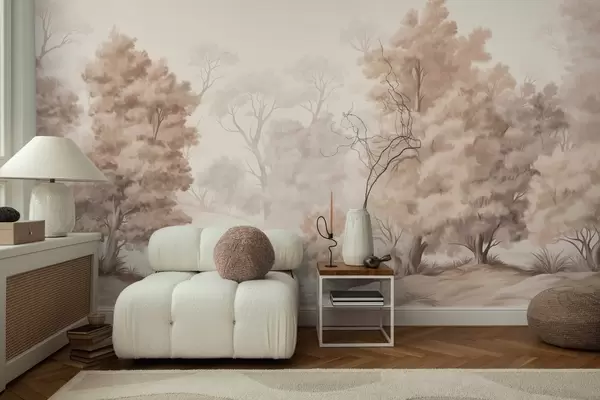 Fototapetak Texturált tájképfestmény, amely egy magas fákkal és fűvel borított erdőt ábrázol, tompított és lágy színekkel, nyugtató hangulatú jelenettel Nr. w09474