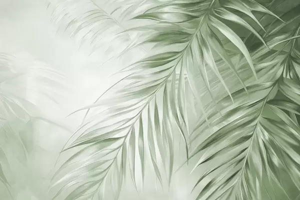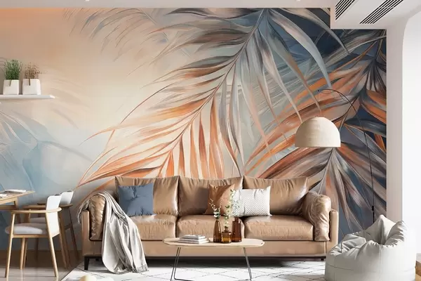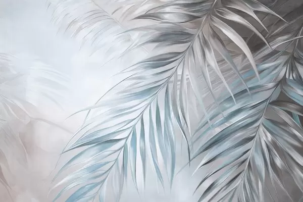 Fototapetak Narancssárga és kék árnyalatú pálmalevelek, világos textúrájú háttér lágy színekkel, elegáns trópusi stílus Nr. w09475
