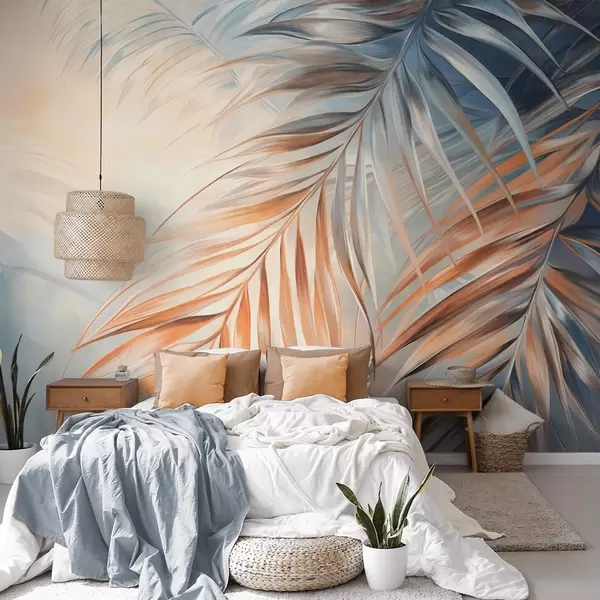 Fototapetak Narancssárga és kék árnyalatú pálmalevelek, világos textúrájú háttér lágy színekkel, elegáns trópusi stílus Nr. w09475