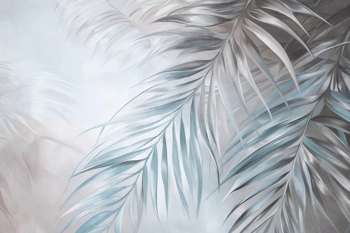 Fototapetak Szürke és kék árnyalatú pálmalevelek, világos textúrájú háttér lágy színekkel, elegáns trópusi stílus Nr. w09475v1