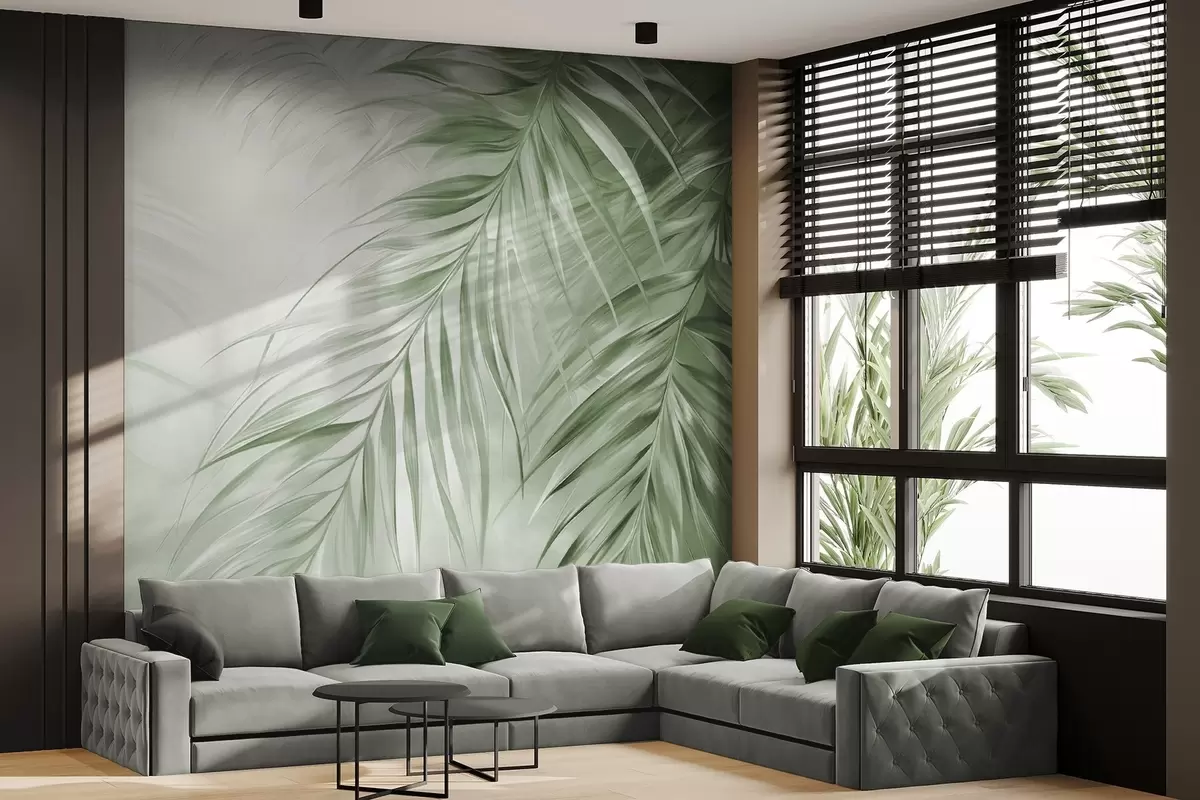 Fototapetak Zöld árnyalatú pálmalevelek, világos textúrájú háttér lágy színekkel, elegáns trópusi stílus Nr. w09475v2