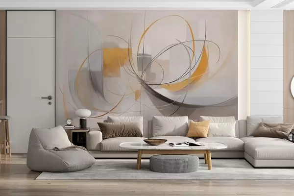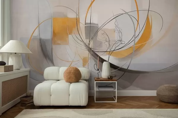 Fototapetak Absztrakt textúrájú modern festészeti stílus ívelt vonalakkal és geometrikus formákkal szürke, fehér és narancssárga árnyalatokban Nr. w09476