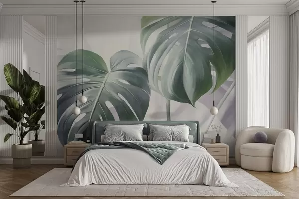 Fototapetak Texturált monstera levelek, nagyok és zöldek, puha, világos absztrakt háttér előtt Nr. w09477