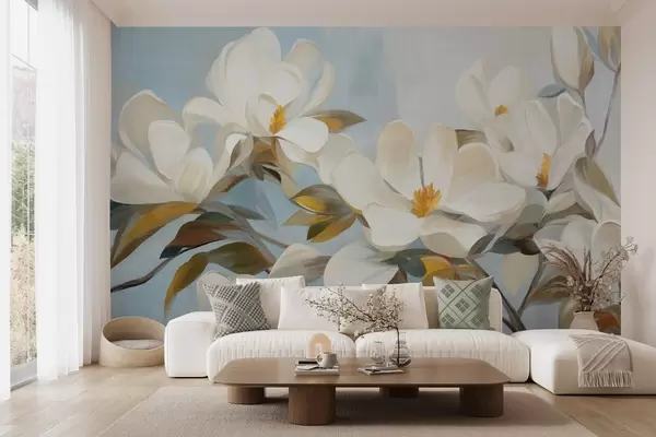 Fototapetak Fehér magnóliák zöld levelekkel, világoskék háttérrel, absztrakt ecsetvonásokkal imitálva Nr. w09478