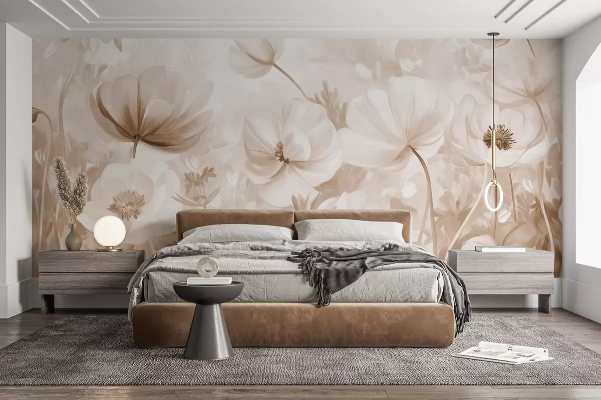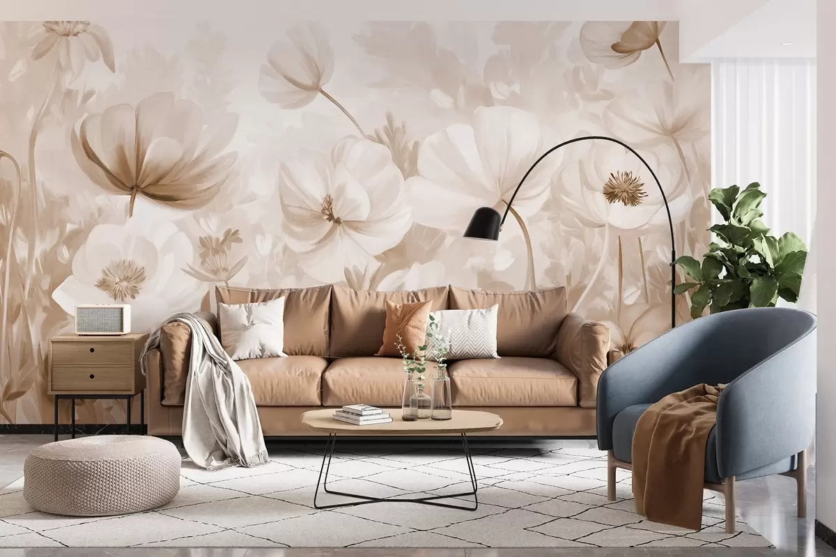 Fototapetak Beige virágok mezője finom szirmokkal, puha barna levelekkel, álomszerű, texturált akvarell stílusban Nr. w09481v1
