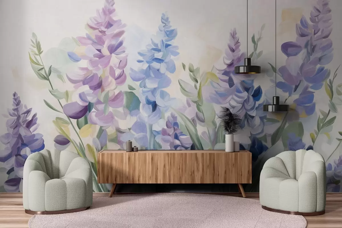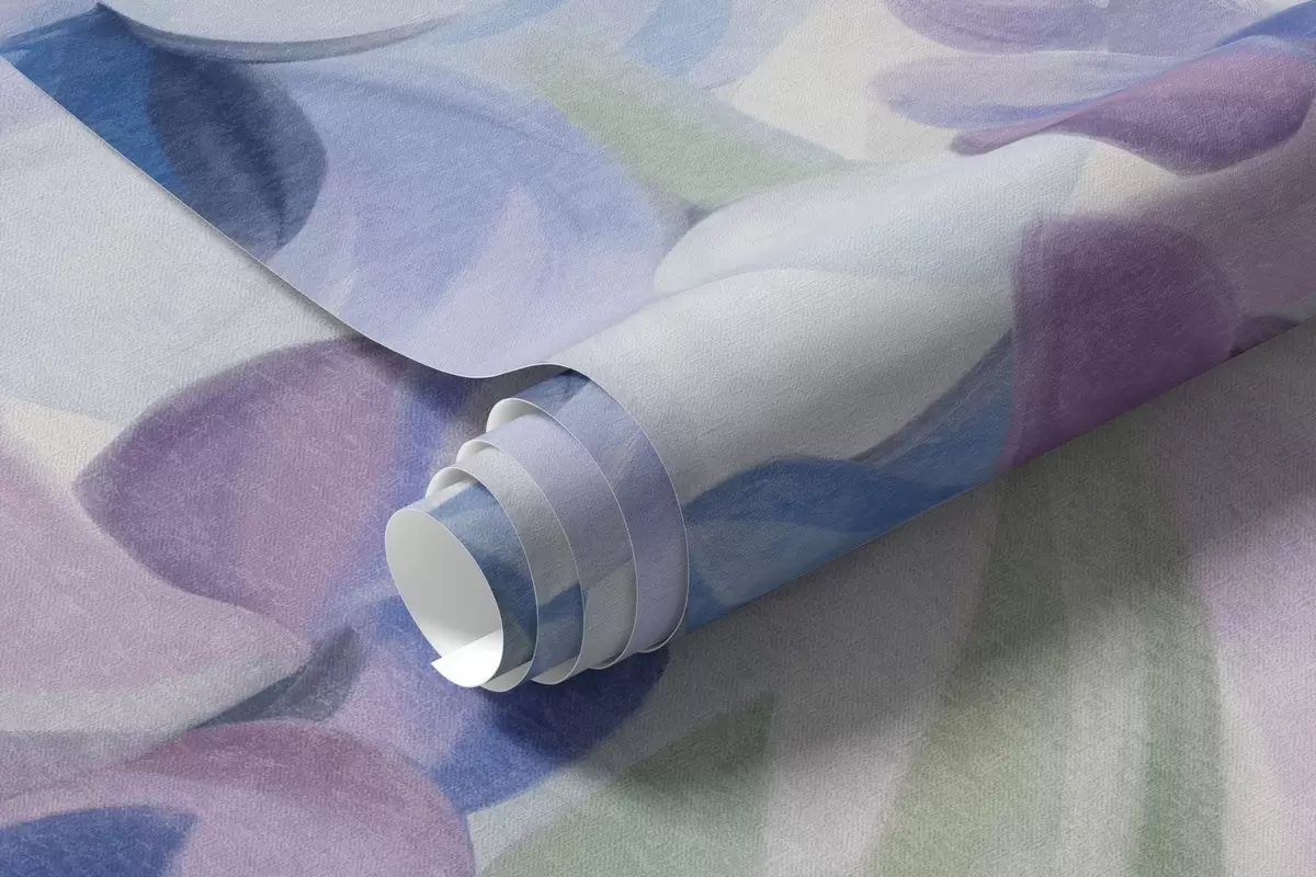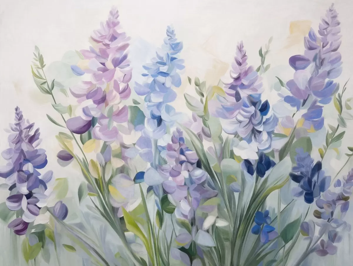 Fototapetak Lila és kék textúrájú virágok kék levelekkel, világos háttérrel, lágy ecsetvonásokkal, élénk színekkel Nr. w09482