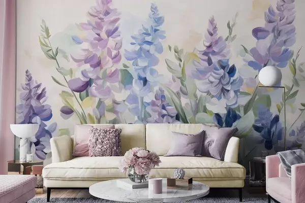 Fototapetak Lila és kék textúrájú virágok kék levelekkel, világos háttérrel, lágy ecsetvonásokkal, élénk színekkel Nr. w09482