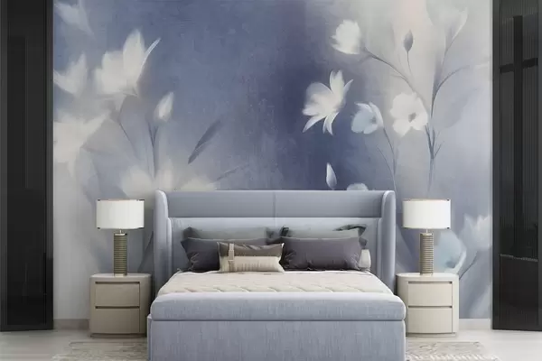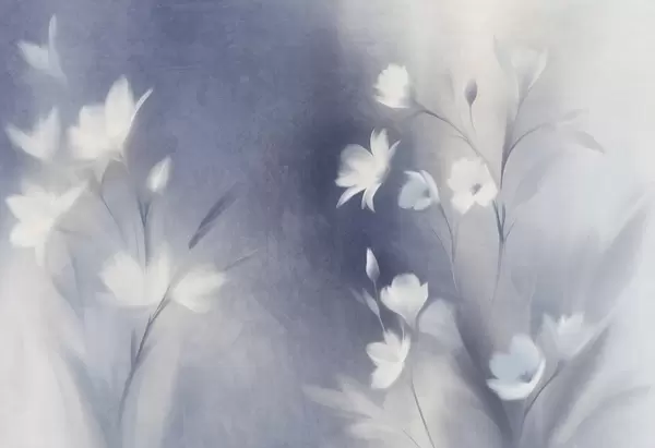 Fototapetak Fehér textúrájú virágok hosszú szárakkal, puha rügyekkel, kék és fehér árnyalatokból álló homályos háttér előtt Nr. w09484