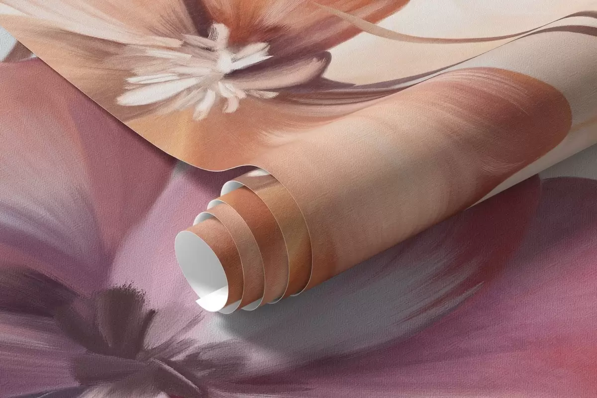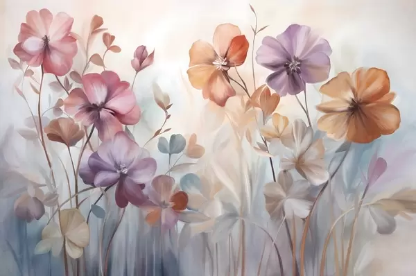 Fototapetak Texturált virágkompozíció rózsaszín, lila és narancssárga virágokkal, zöld szárakkal és levelekkel, lágy pasztell színekkel Nr. w09486