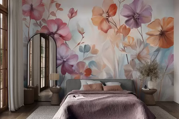 Fototapetak Texturált virágkompozíció rózsaszín, lila és narancssárga virágokkal, zöld szárakkal és levelekkel, lágy pasztell színekkel Nr. w09486