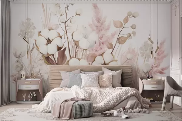 Fototapetak Pamut textúrájú virágok fehér és rózsaszín pampas fűvel, bézs és barna levelekkel és gyógynövényekkel, fehér háttérrel Nr. w09489