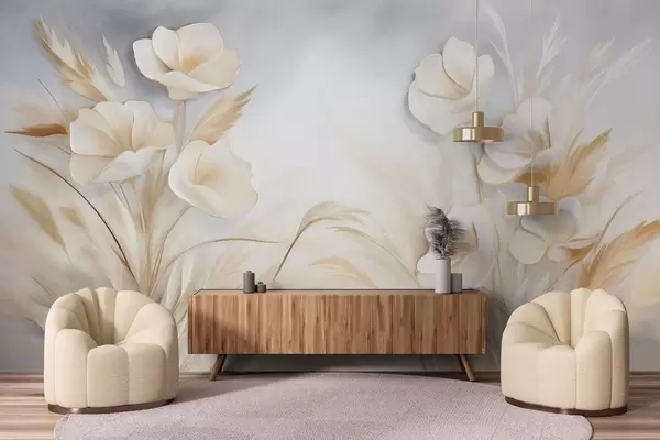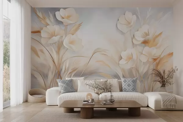 Fototapetak Fehér virágok, bézs színű nád és pampas fű, texturált, elegáns, minimalista stílus, absztrakt tájkép háttér Nr. w09490