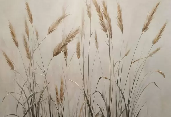 Fototapetak Búzával borított mező sárga kalászokkal, bézs háttér, természetes megvilágítás, meleg tónusok, részletgazdag ecsetvonások Nr. w09493