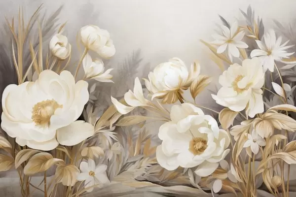 Fototapetak Fehér és sárga pünkösdi rózsák és más virágok magas fűvel és levelekkel, lágy, festői textúrájú stílusban Nr. w09494
