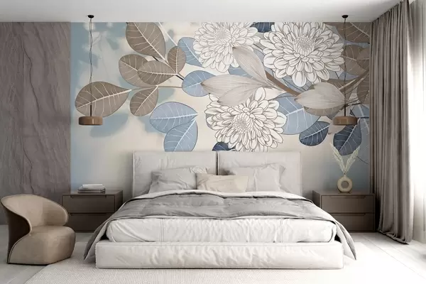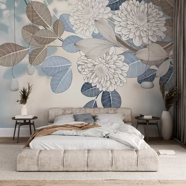 Fototapetak Fehér virágok kék és barna levelekkel, világoskék texturált háttér, virágkompozíció, részletes vonalas grafika Nr. w09496